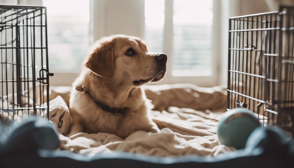 Effective crate training for aggressive dogs involves selecting a durable crate that allows the dog to stand, turn, and lie comfortably. Introduce the crate gradually, using positive reinforcement to create a safe and inviting space. Establish a consistent routine with designated feeding, exercise, and crate times to reduce anxiety and aggression. Guarantee the crate is well-ventilated and securely latched to prevent escapes. Avoid overcoating by balancing crate time with outdoor activities and socialization. Employing alternative confinement methods can also be beneficial. For more in-depth guidance on managing aggression through crate training, additional information is available.